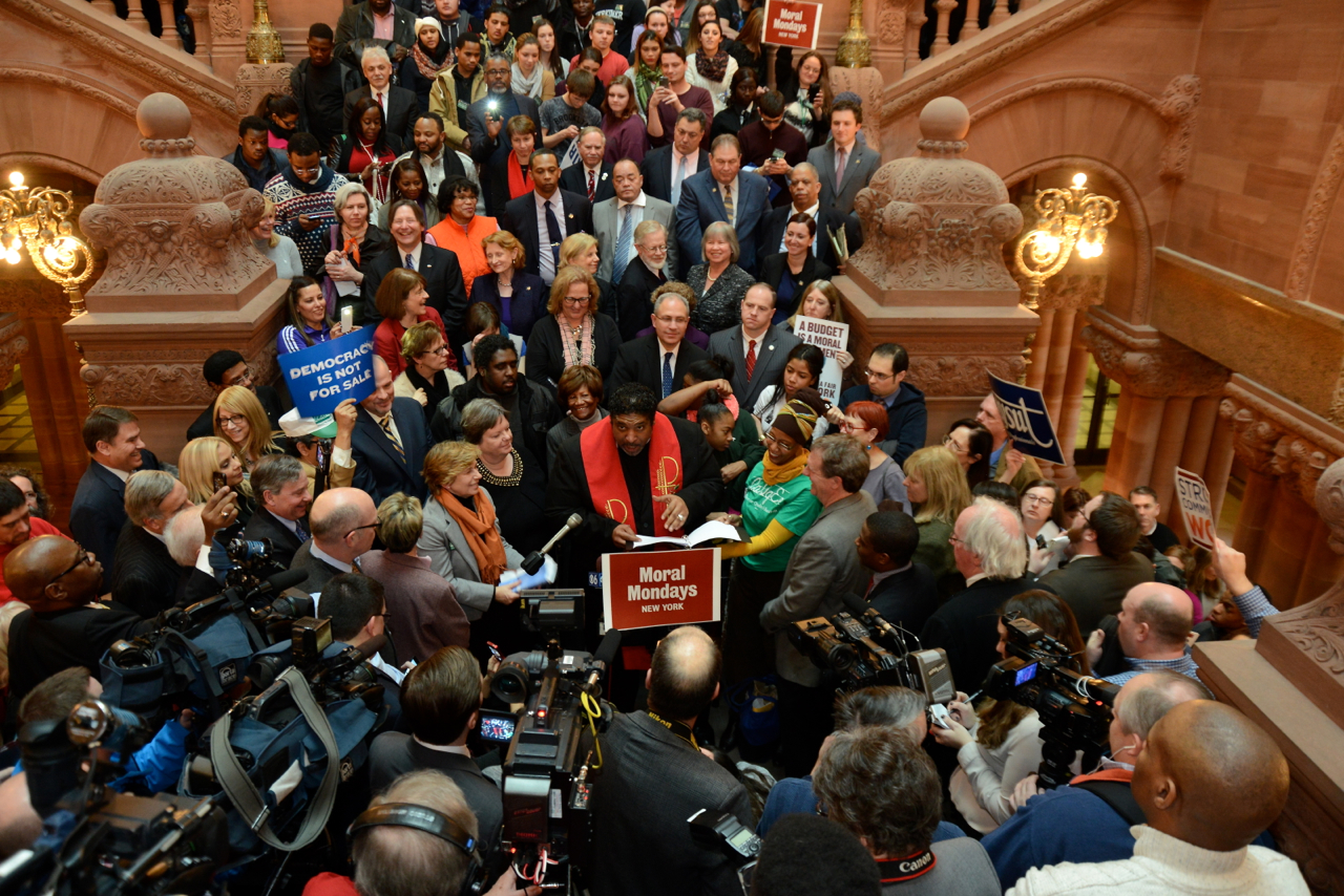 Calling on the State legislators to pass a comprehensive fair elections reform package, surrounded by supporters.